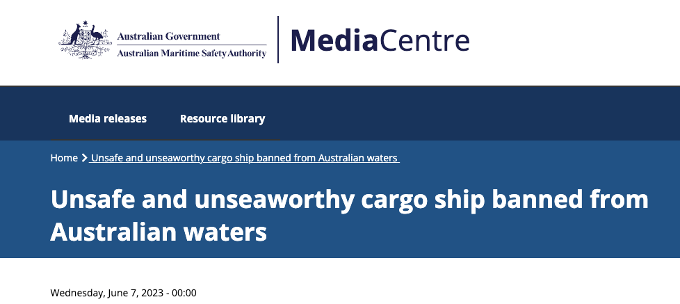 近日,澳大利亚海事安全局(AMSA)禁止一艘杂货船在90天内进入澳大利亚水域。