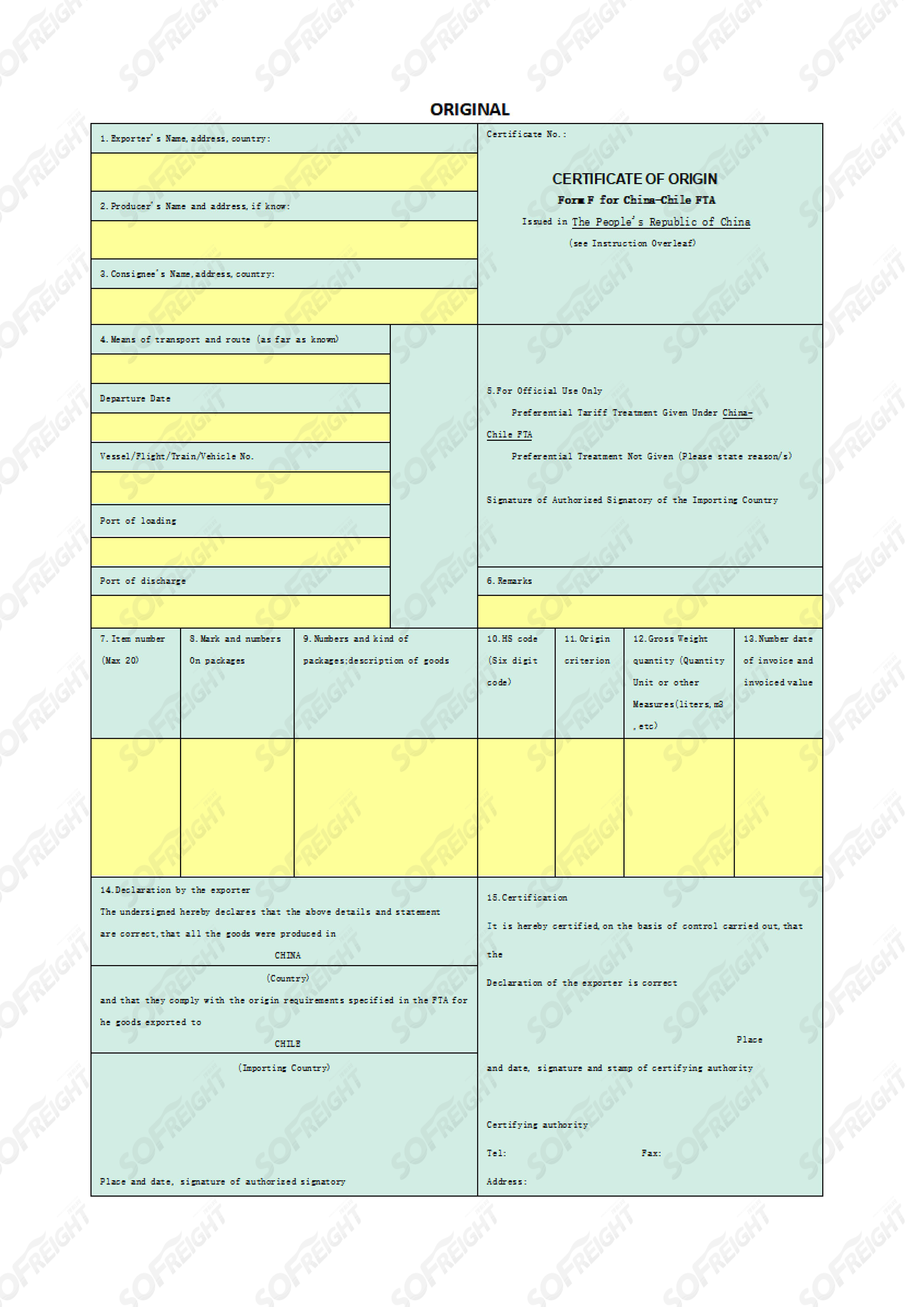 中国—智利自由贸易区原产地证书,又称Form F。中国与智利自由贸易区享受优惠待遇而接受本证书的国家。在中国,由国家质检总局设在各地的检验检疫机构负责签发这种原产地证书。