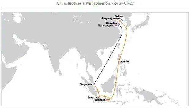 CIP2挂靠次序:新港 - 大连 - 连云港 - 青岛 - 新加坡 - 雅加达 - 泗水 - 马尼拉 - 新港