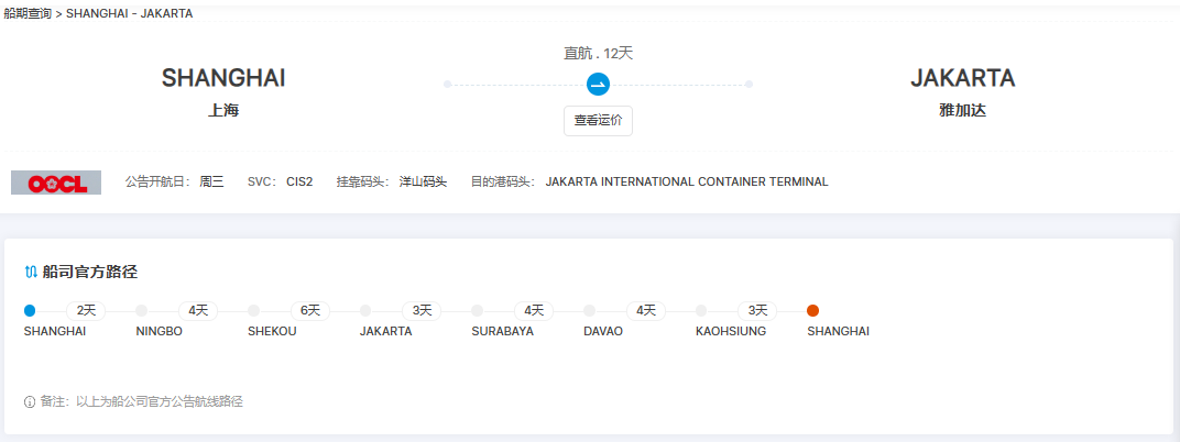CIP1靠港次序:上海 - 宁波 - 泉州 - 汕头 - 蛇口 - 南沙 - 雅加达 - 泗水 - 达沃 - 上海