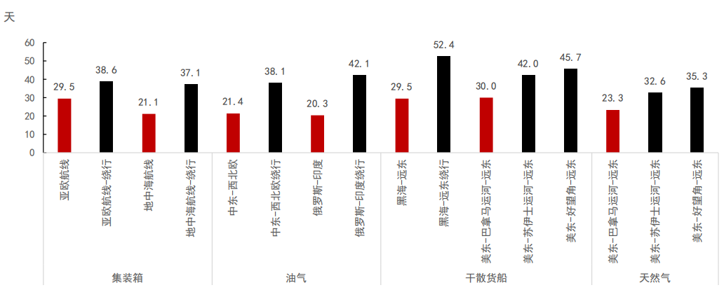 不同航线、不同类型的船舶在绕行好望角后的单次航行时间有所不同。以集装箱船为例,亚欧航线船舶绕行好望角后,单航次的时间将从29.5天增加到38.6天,增加约9天的航运时间。