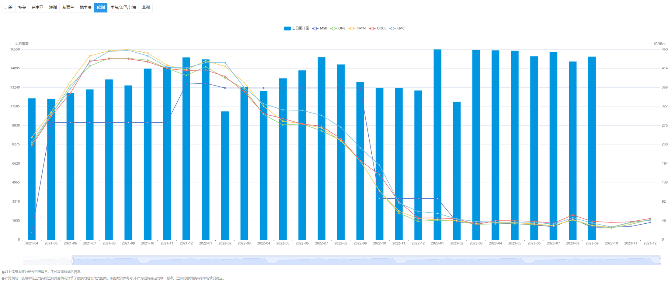 作为对比,在搜航网运价趋势功能中,可以查看欧洲航线运价指数,近年欧洲航线各船司运价变化趋势。
