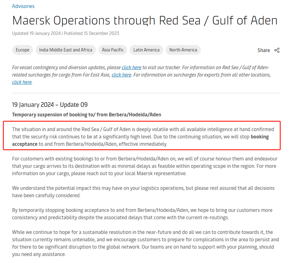 近日,马士基官网发布通知,由于红海局势非常不稳定,所有现有情报均证实安全风险仍然处于极高水平,将决定停止接受往返柏培拉(berbera)/荷台达(Hodeida)/亚丁(Aden)以及吉布提(Djibouti)的订舱。