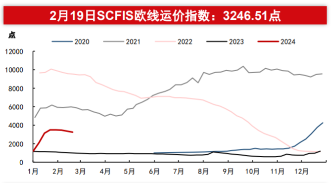 由于红海航运危机的影响持续扩散,北美航线由于货量改善,供需关系良好,叠加春节前的出货潮,使得即期市场运价整体平稳上升。