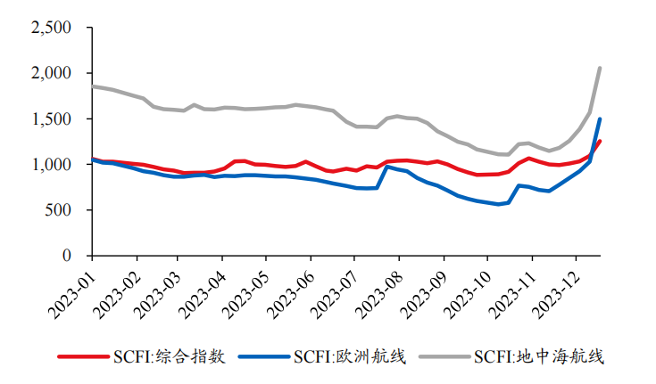 受此影响,SCFI(上海出口集装箱运价指数)12月22日收于1255点,周环比+14.8%,其中欧线大涨46%。