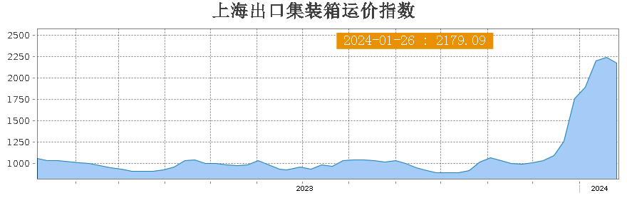 在此期间,SCFI欧线价格连涨8周,累计涨幅高达339%。截至1月26日,SCFI综合指数终于开始回落,降至2179.09点,周度环比下降2.7%