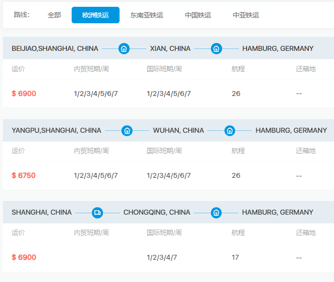 根据搜航网运价查询中的欧洲铁路运价信息,自2023年11月底以来,从中国到欧洲的铁路运价也上涨至近7000美元。