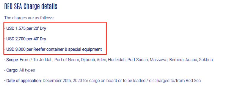 其中,达飞海运征收的RED SEA Charge(红海附加费),每20英尺干箱1575美元,每40英尺干箱2700美元,每个冷藏集装箱和特殊设备3000美元。