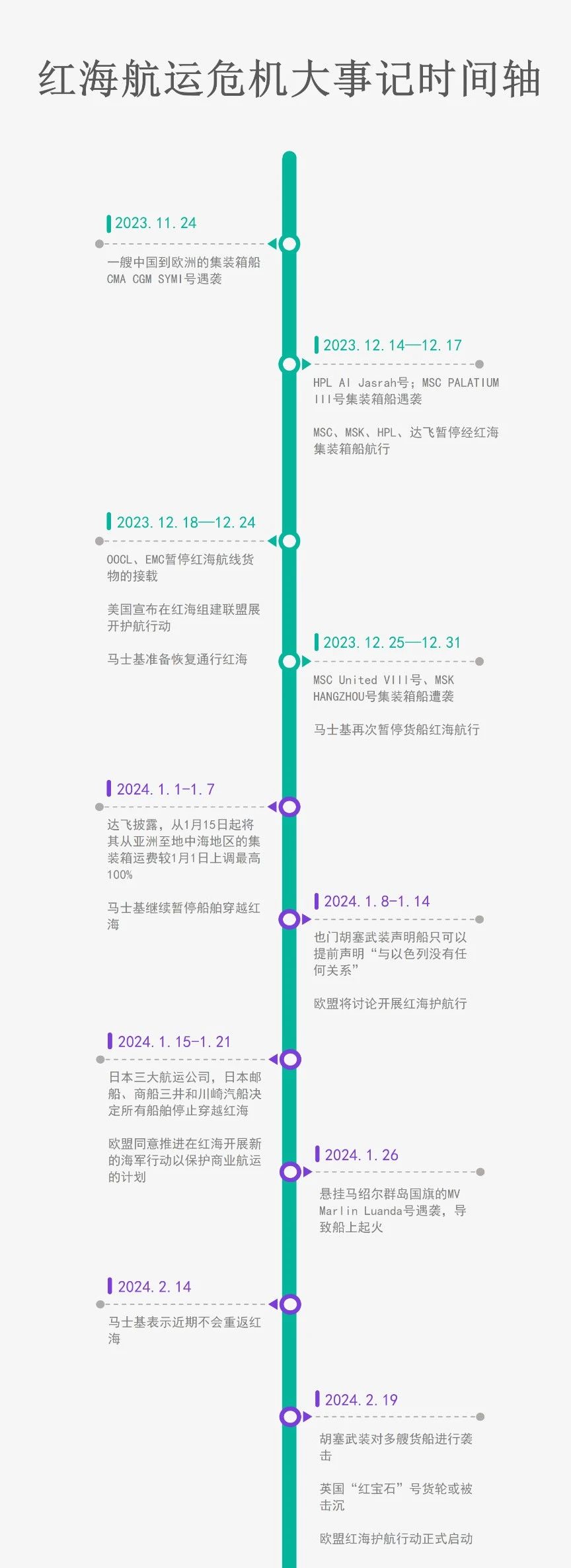 2023年12月14日,马士基表示有商船遇袭,暂停通过曼德海峡。随后赫伯罗特、MSC等多家船公司也纷纷宣布暂停经过红海/苏伊士运河的航线。