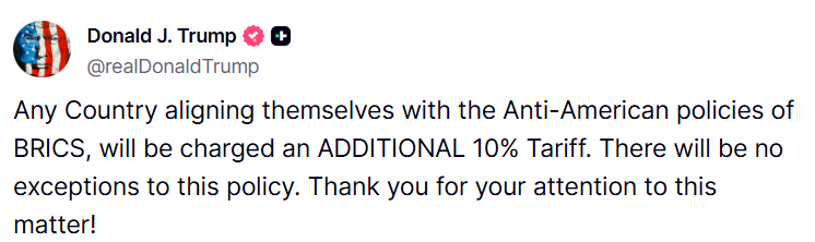 “任何与金砖国家的反美政策保持一致的国家将被额外征收10%的关税。这项政策没有例外。感谢你们对此事的关注!”特朗普在Truth Social上发表帖子称。