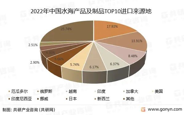 市场方面,据共研产业咨询显示,2022年我国水海产品及制品进口额排名前十的国家/地区分别为厄瓜多尔、俄罗斯、越南、印度、加拿大、美国、印度尼西亚、挪威、日本、新西兰,合计占我国该产品进口额的74.26%。