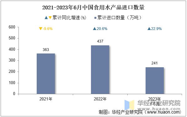 据华经产业研究院数据显示:2023年1-6月中国食用水产品进口数量为241万吨,相比2022年同期增长了45万吨,同比增长22.9%;进口金额为994731.9万美元,相比2022年同期增长了173746.3万美元,同比增长21.3%。