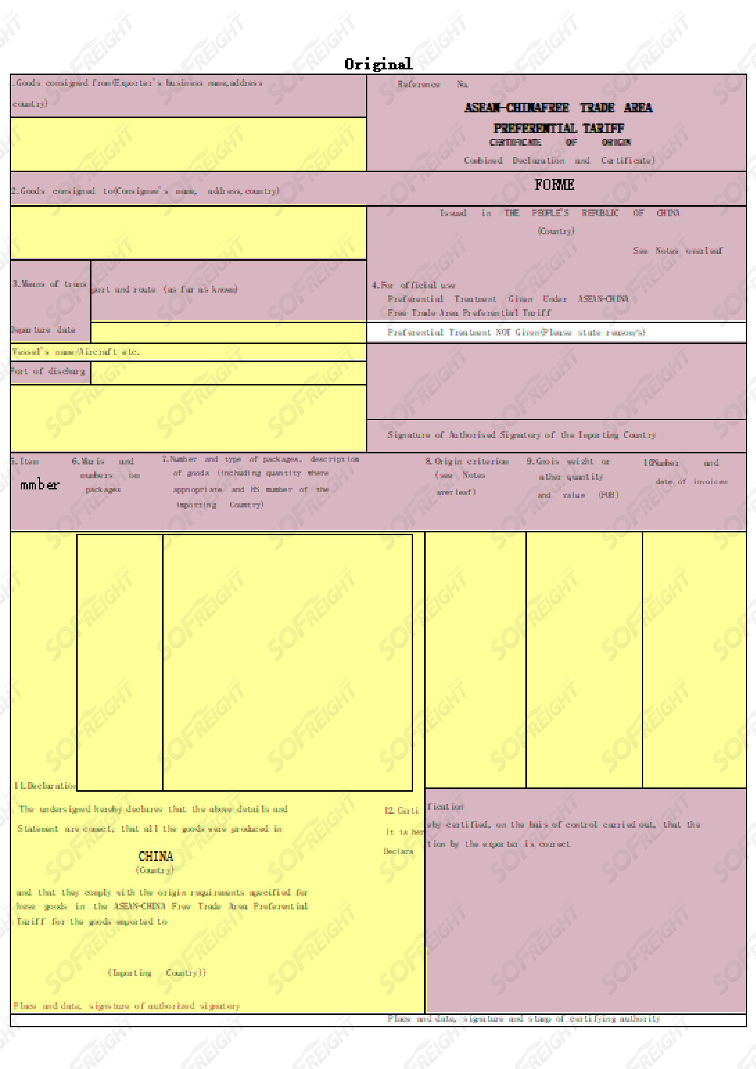 中国东盟自由贸易区原产地证,又称格式E,或FORM E。是根据中国与东盟签署的《中国-东盟全面经济合作框架协议货物贸易协定》(以下简称《货物贸易协定》)的规定签署的一种优惠性原产地证明书。证书为棕色,一式四份。在中国,由国家质检总局设在各地的检验检疫机构负责签发这种原产地证书。