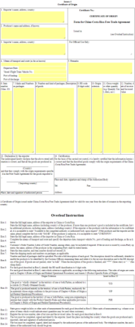 中国-哥斯达黎加自由贸易协定原产地证书(FORM L)中国受惠产品范围:纺织原料及制品、轻工、机械、电气设备、蔬菜、水果、汽车、化工、生皮毛及皮革等产品。