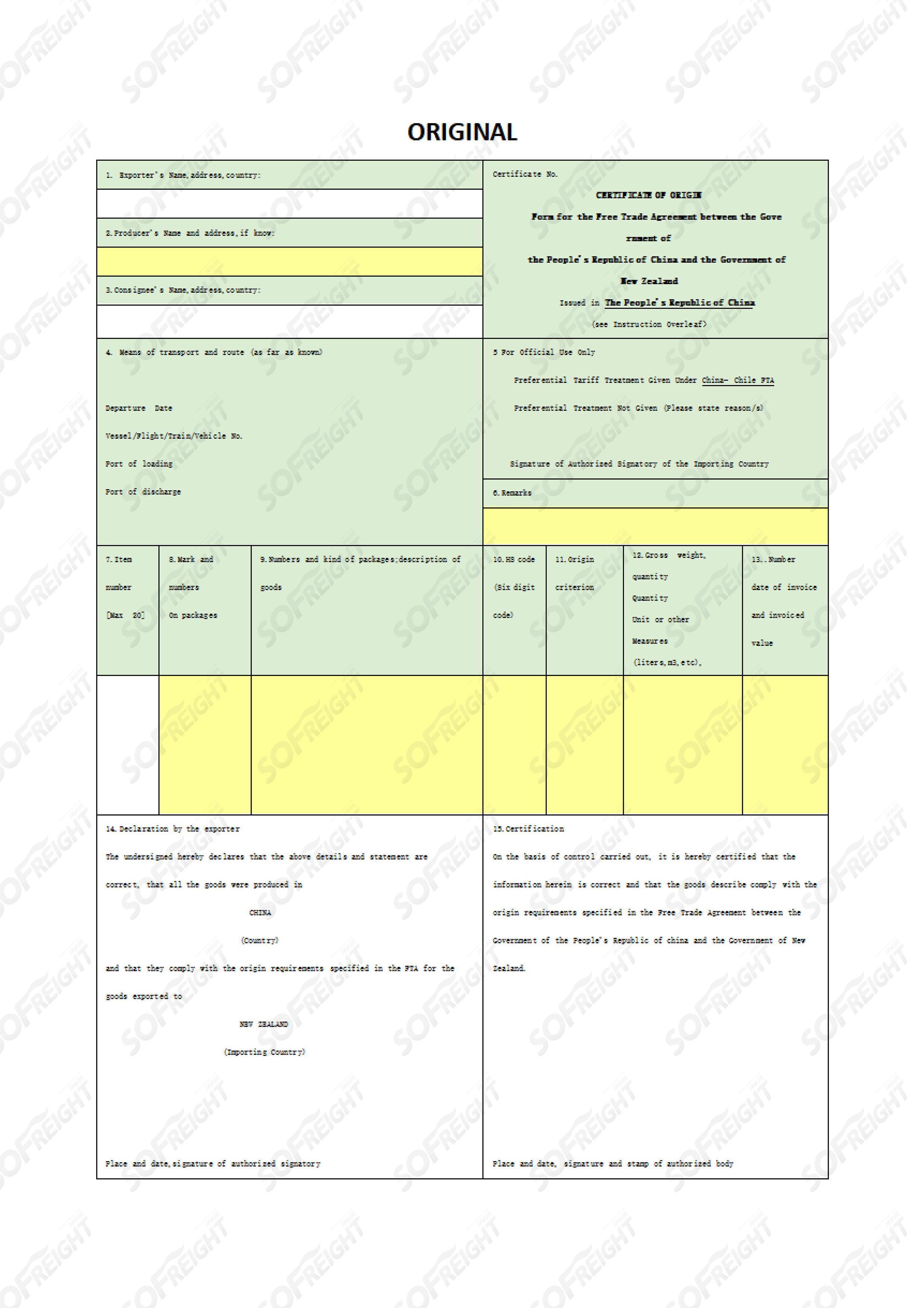 中国—新西兰自由贸易区优惠原产地证书是根据《中国政府和新西兰政府自由贸易协定》签发的就中国新西兰两国之间相互给予关税减免待遇的官方证明文件。《中华人民共和国政府和新西兰政府自由贸易协定》(以下简称《协定》)于2008年10月1日起开始实施。为使我国出口到新西兰的产品能够享受《协定》项下关税优惠待遇,自2008年10月1日起,各地出入境检验检疫机构开始签发中国—新西兰自由贸易区优惠原产地证明书(Form N)。