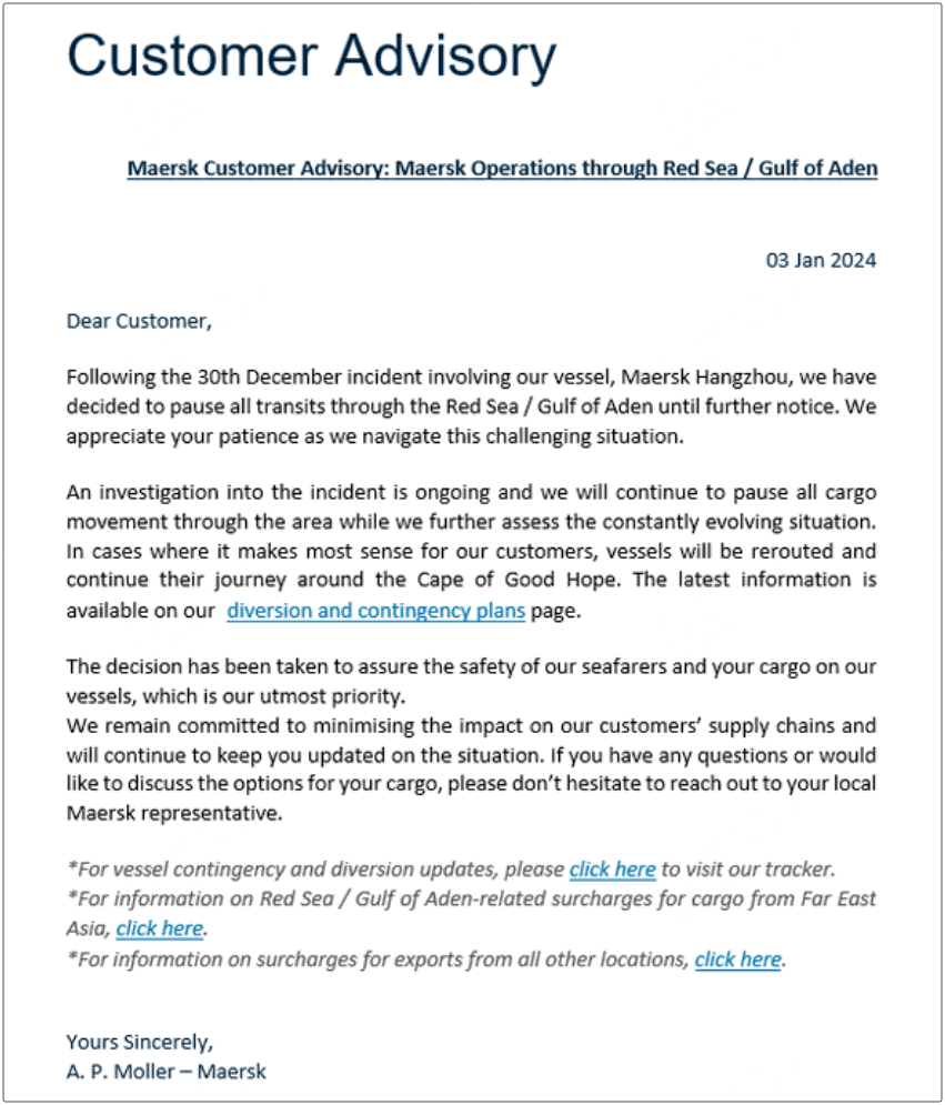 2024年1月2日,马士基最新公告宣布,在12月30日涉及船舶“Maersk Hangzhou”号发生事故后,决定继续暂停红海航行,暂停所有通过红海/亚丁湾的过境,直至另行通知。