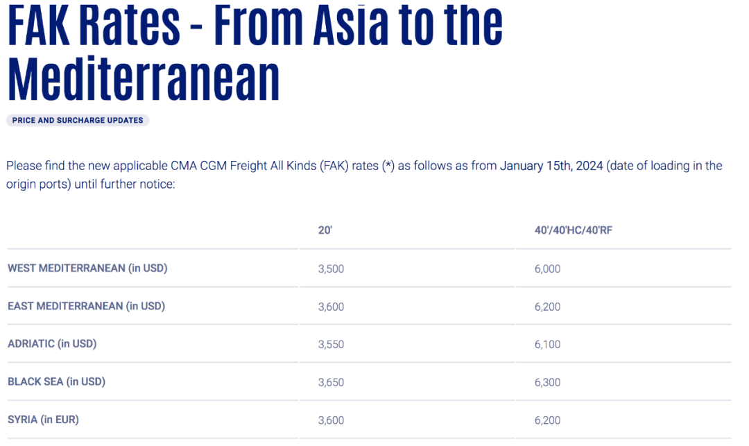 亚洲至东地中海航线的运费,从2024年1月1日的2100美元/TEU、3200美元/FEU,上调到2024年1月15日的3600美元/TEU、6200美元/FEU。