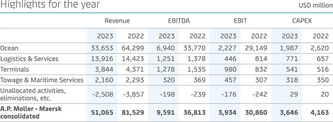2023年全年,马士基全年实现营业收入511亿美元,同比下降37.4%;EBITDA为95.9亿美元,同比下降73.9%;EBIT为39.3亿美元,同比下降87.3%;EBIT利润率为7.7%。