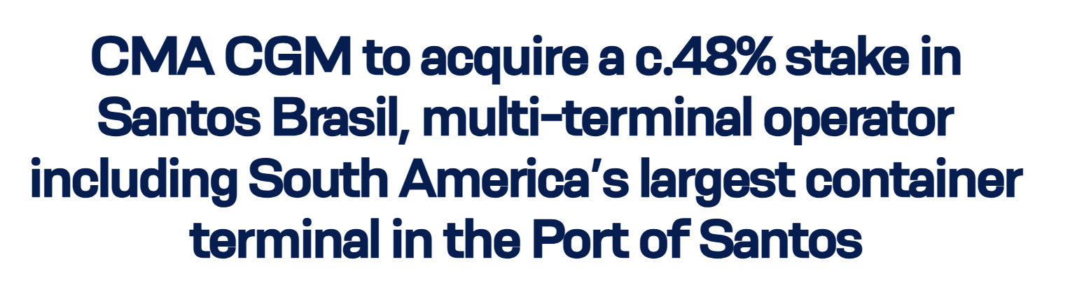 达飞(CMA CGM)近日宣布,该公司从巴西基金管理公司Opportunity手中收购了巴西著名的上市多码头运营商Santos Brasil Participações S/A(“Santos Brasil”)约48%的股份。