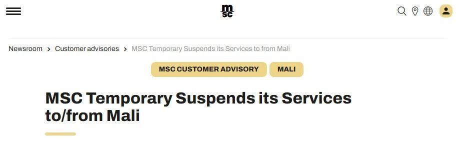 近日,MSC宣布全面暂停马里航线预订。MSC表示,由于安全问题和燃油短缺导致的重大运营挑战,运往马里的货物公路运输暂时停止,直至另行通知。
