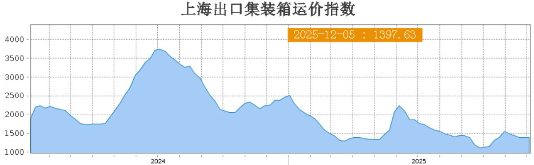 12月5日,上海航运交易所发布的上海出口集装箱综合运价指数为1397.63点,较上期下跌0.4%。