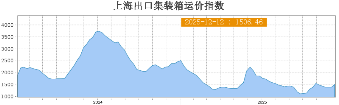 受部分船司推涨影响,12月12日,上海港出口至欧洲基本港市场运价(海运及海运附加费)为1538美元/TEU,较上期上涨9.9%。